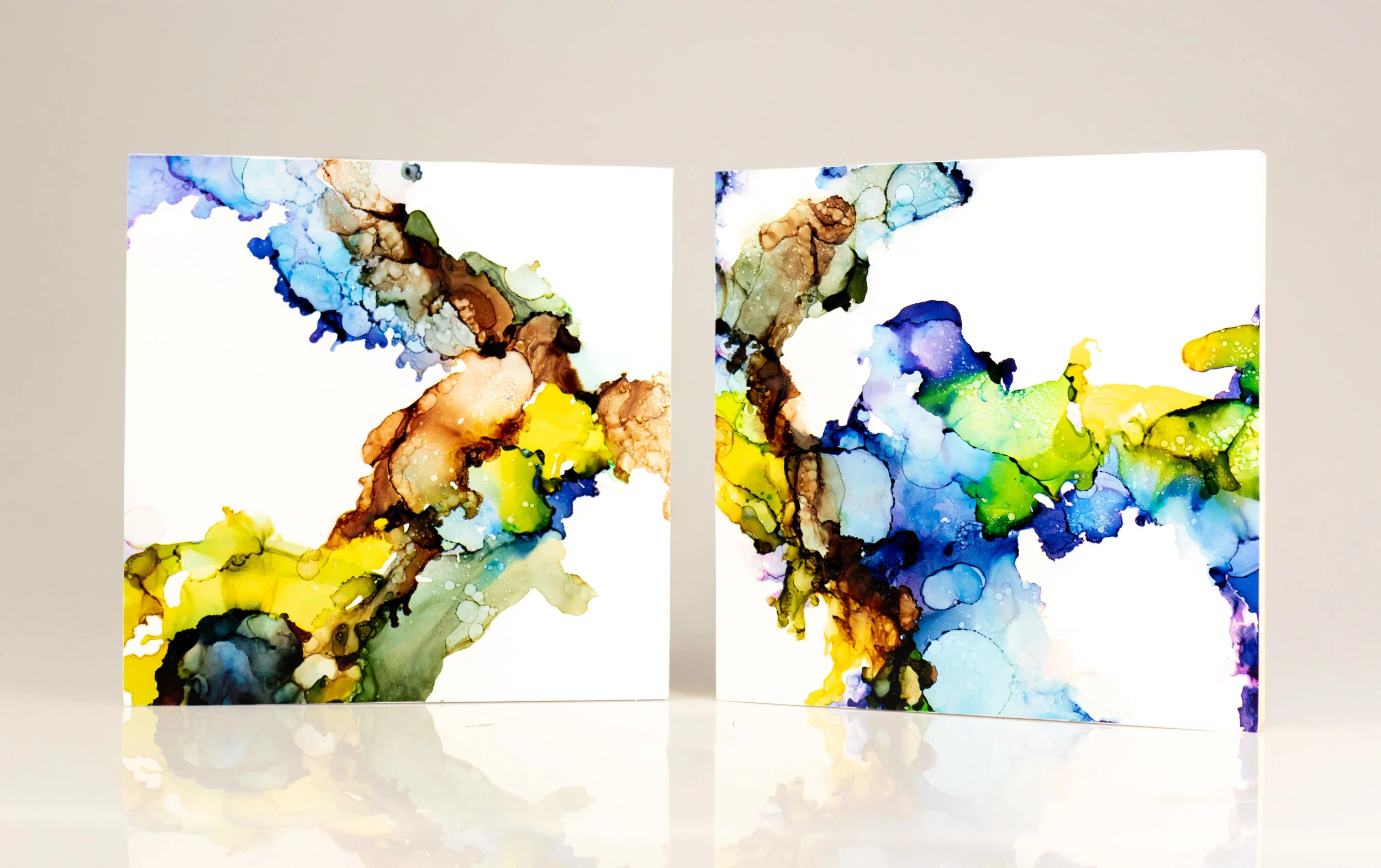 “Hopeful Encounter” 8x8 | Alcohol Ink Diptych on Yupo mounted on Birch | SOLD (but contact me for similar pieces)